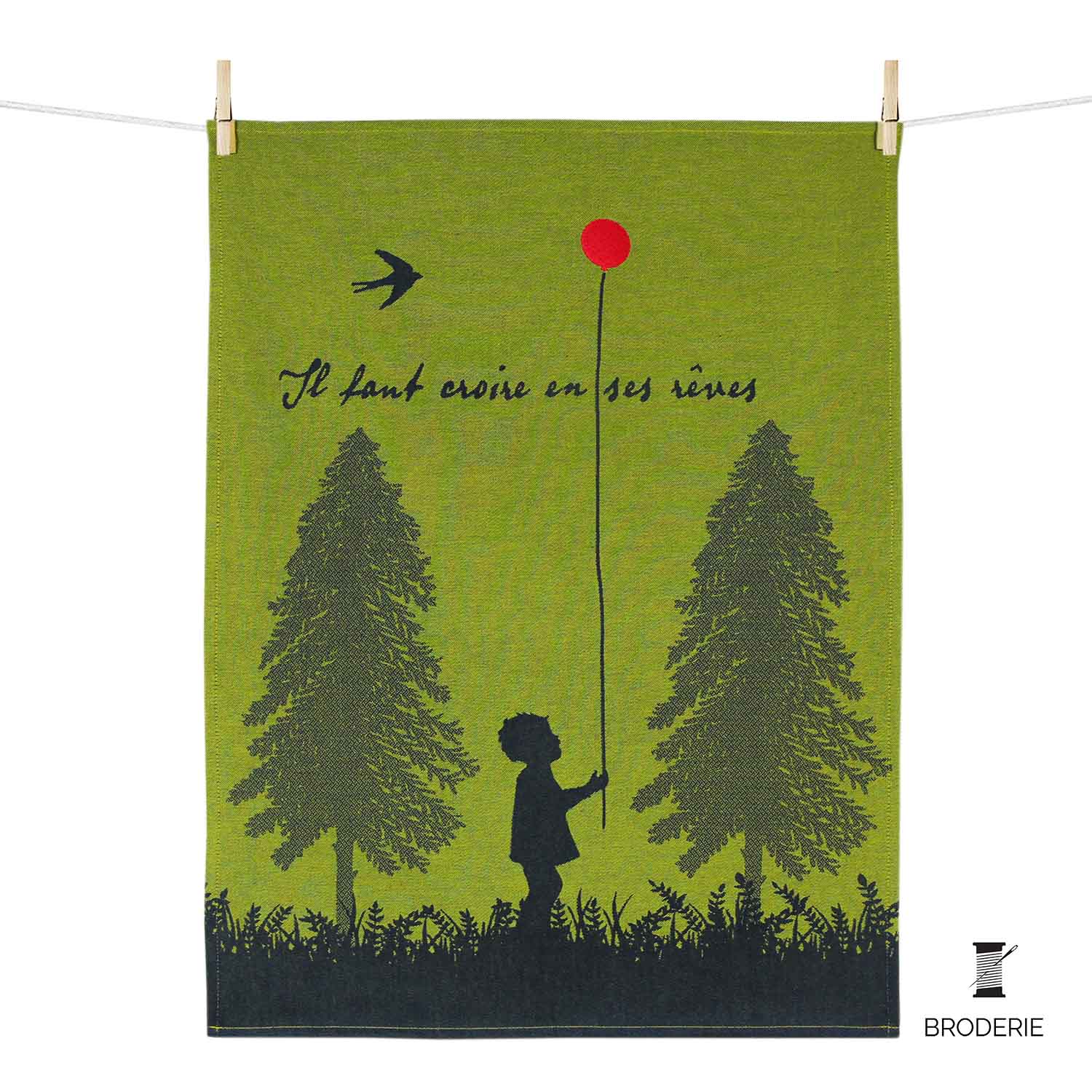 Le torchon brodé “Croire en ses rêves” a été créé par l’artiste Hélène Druvert. Il s’inspire du film Le Ballon Rouge du réalisateur Albert Lamorisse de 1956. Il représente une image poétique de l’enfance.