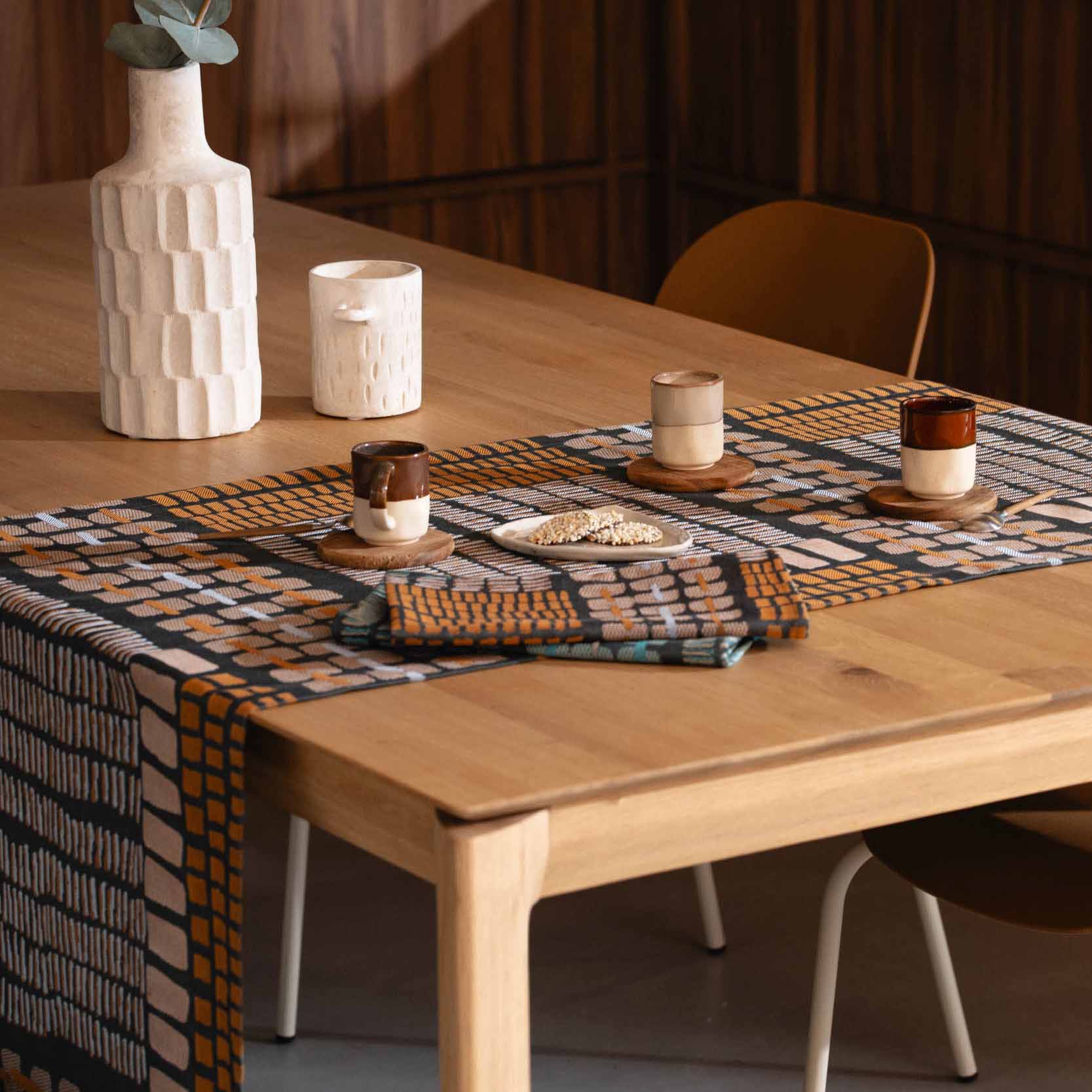 Imaginé en collaboration avec la créatrice textile Laure Vissian, le chemin de table Écailles offre un jeu délicat de formes et de textures en mouvement, inspiré par la nature et les jeux de lumière. Tissé en Jacquard dans notre atelier d’Orthez, il témoigne de notre engagement pour un linge de table à la fois raffiné et créatif.