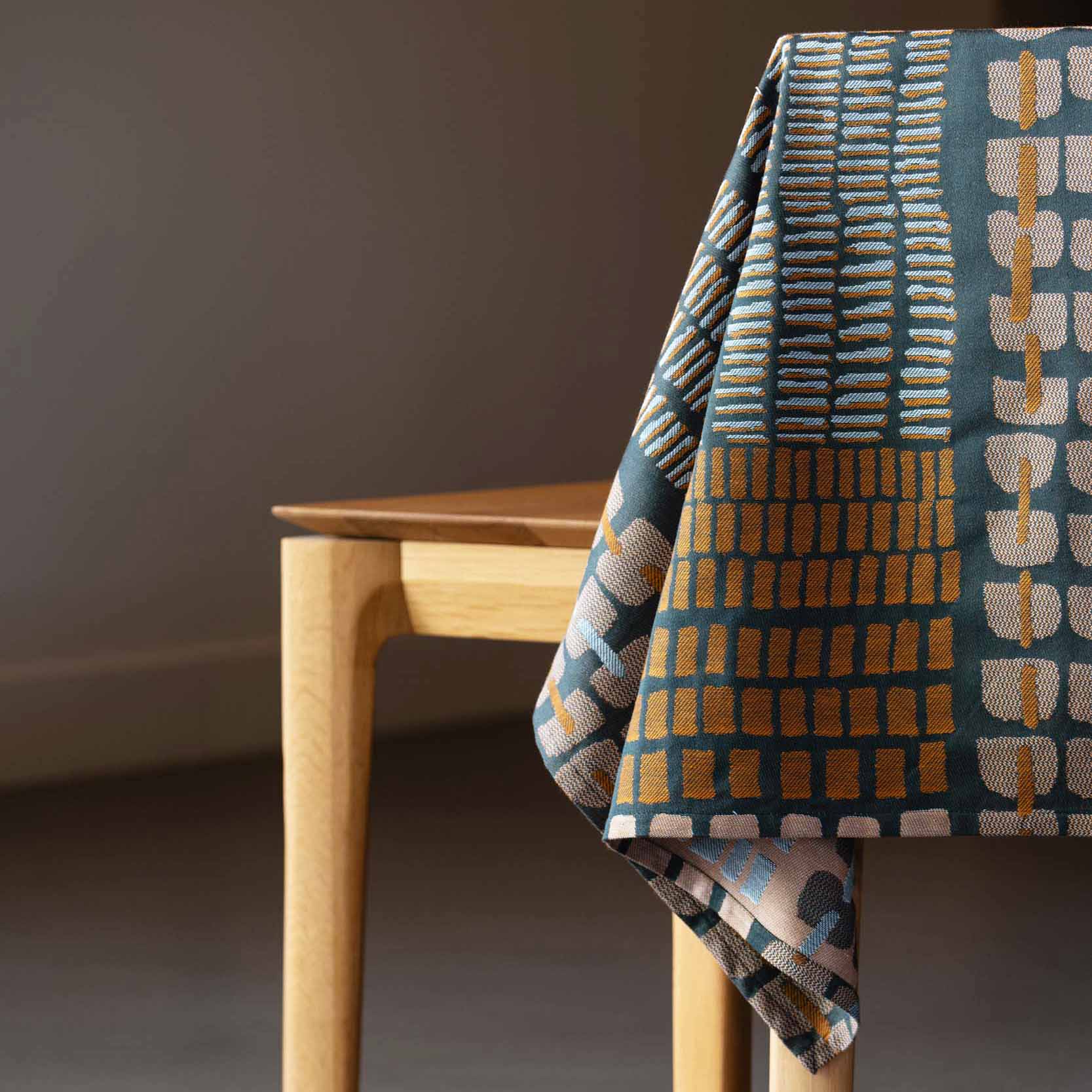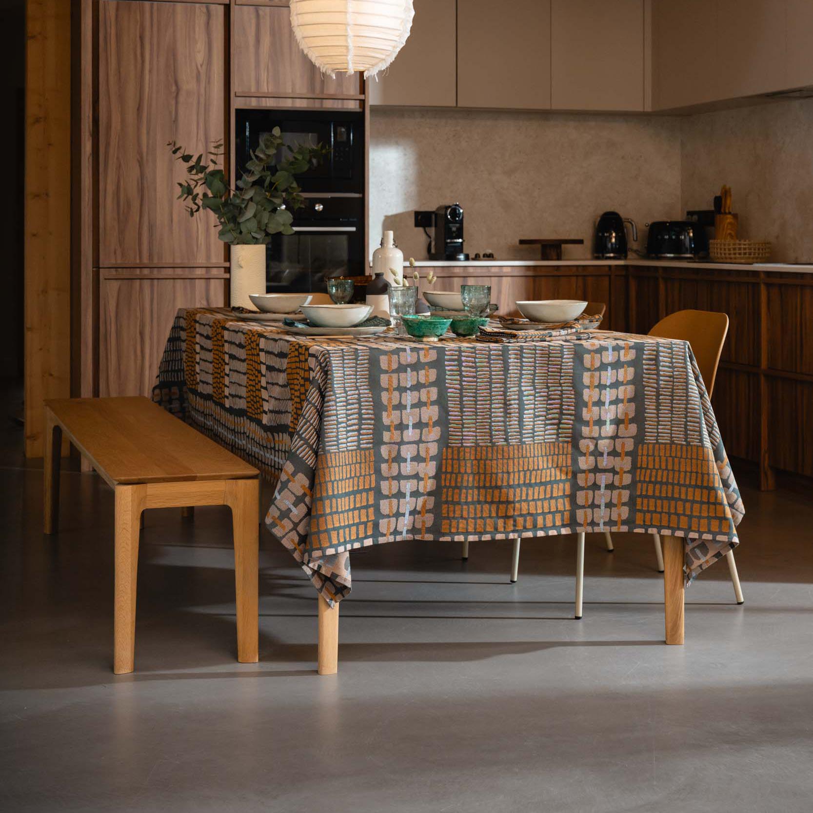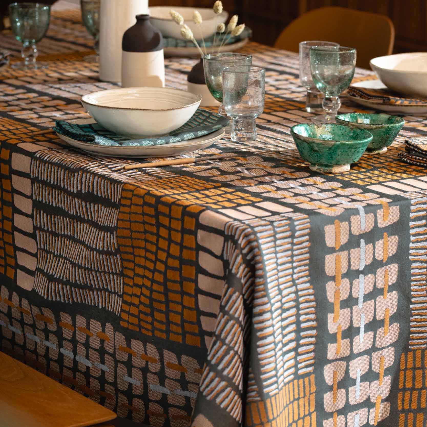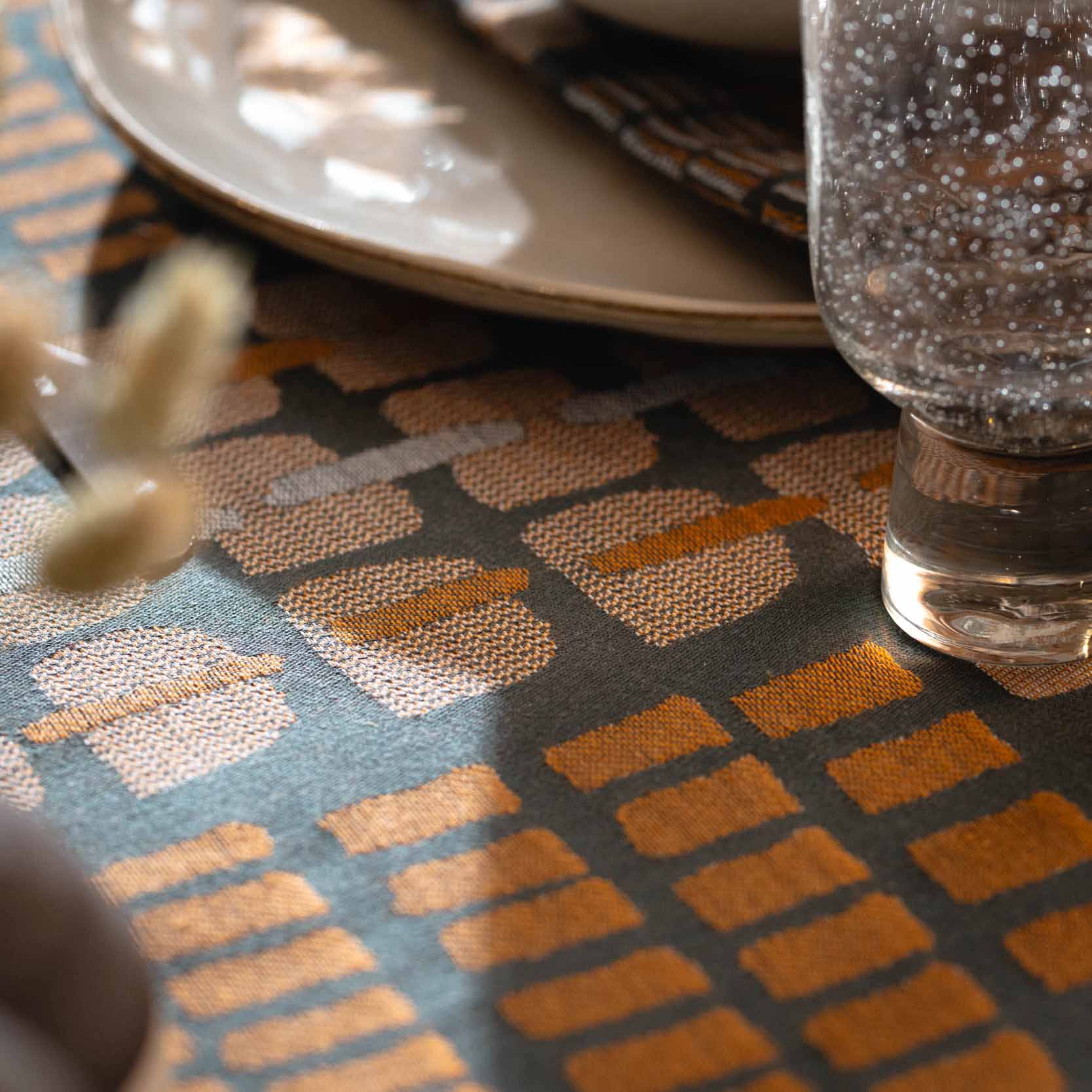 Le motif « Écailles » se décline en nappe, chemin de table et serviette de table.