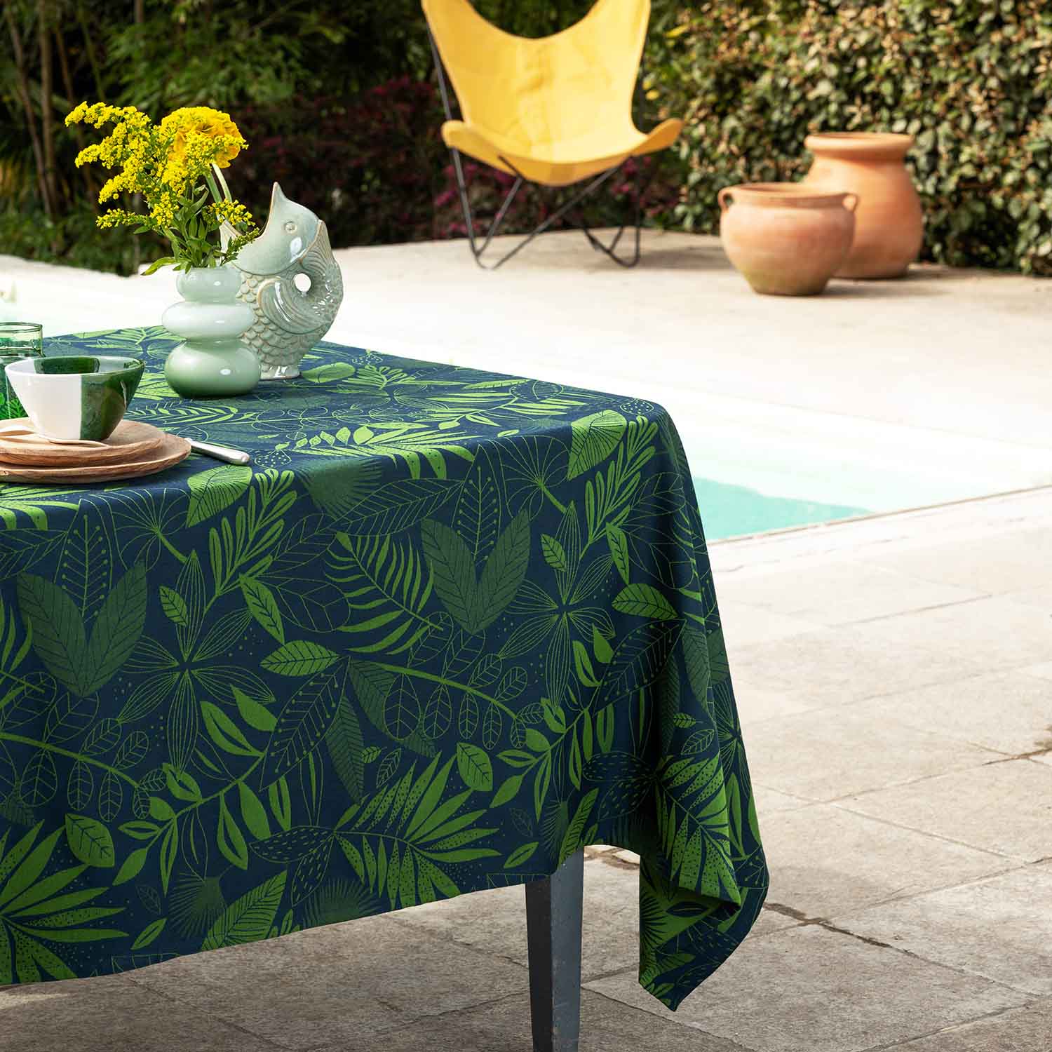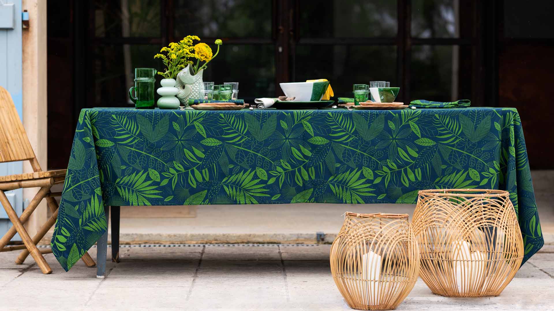 La nappe enduite « Feuillage », imaginée par le collectif d’artistes Mini Labo, nous plonge dans la canopée, cette strate mouvante de la forêt où les feuilles sont directement exposées au soleil. Le beau contraste du bleu marine et du vert lumineux donne un côté hypnotique à ce motif original et dans l’air du temps.