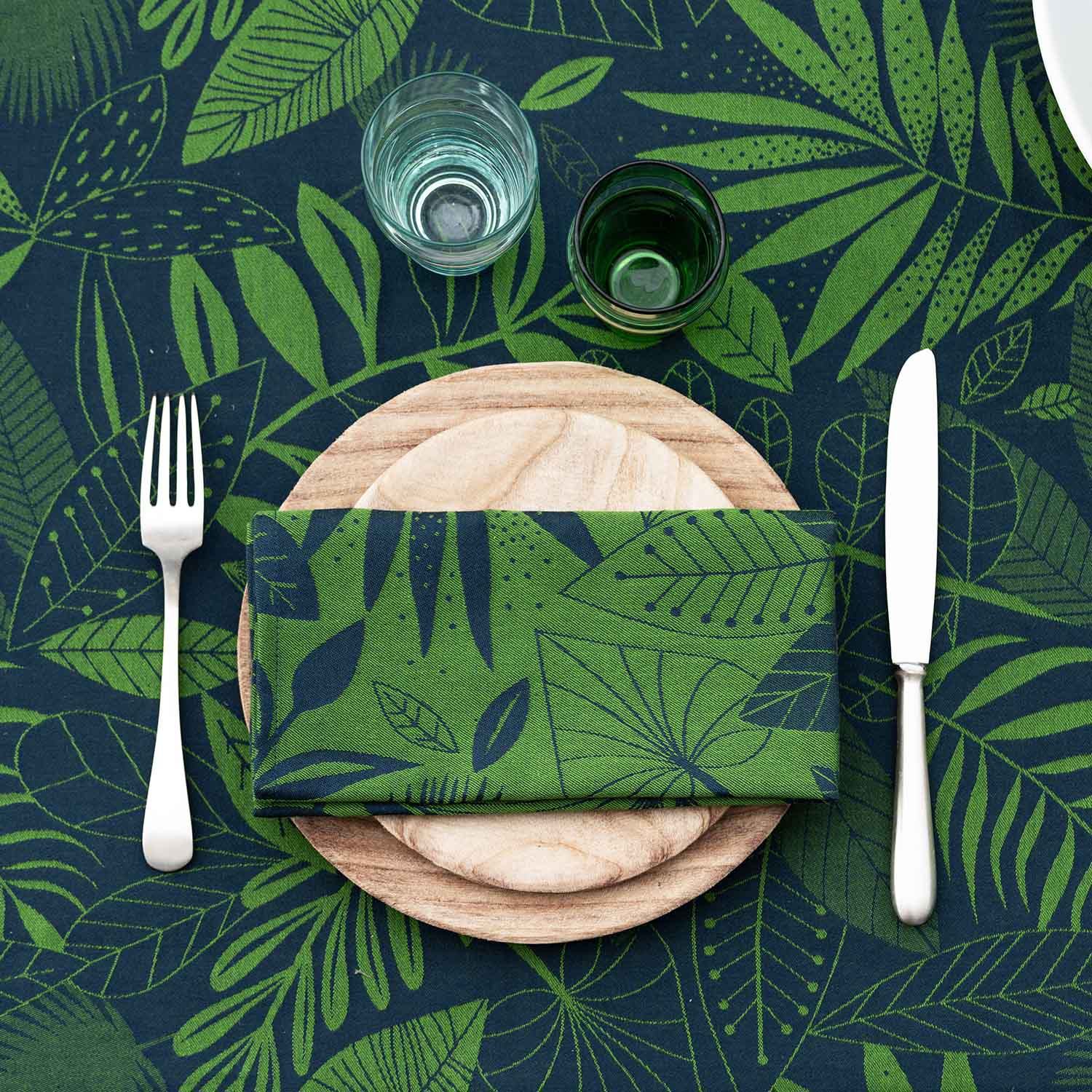 A compléter avec les serviettes assorties : Feuillage bleue pour un côté ton sur ton, ou Feuillage verte pour profiter de l’effet recto/verso du tissage jacquard !