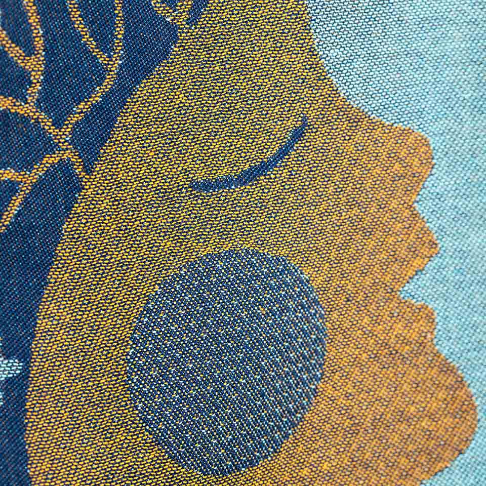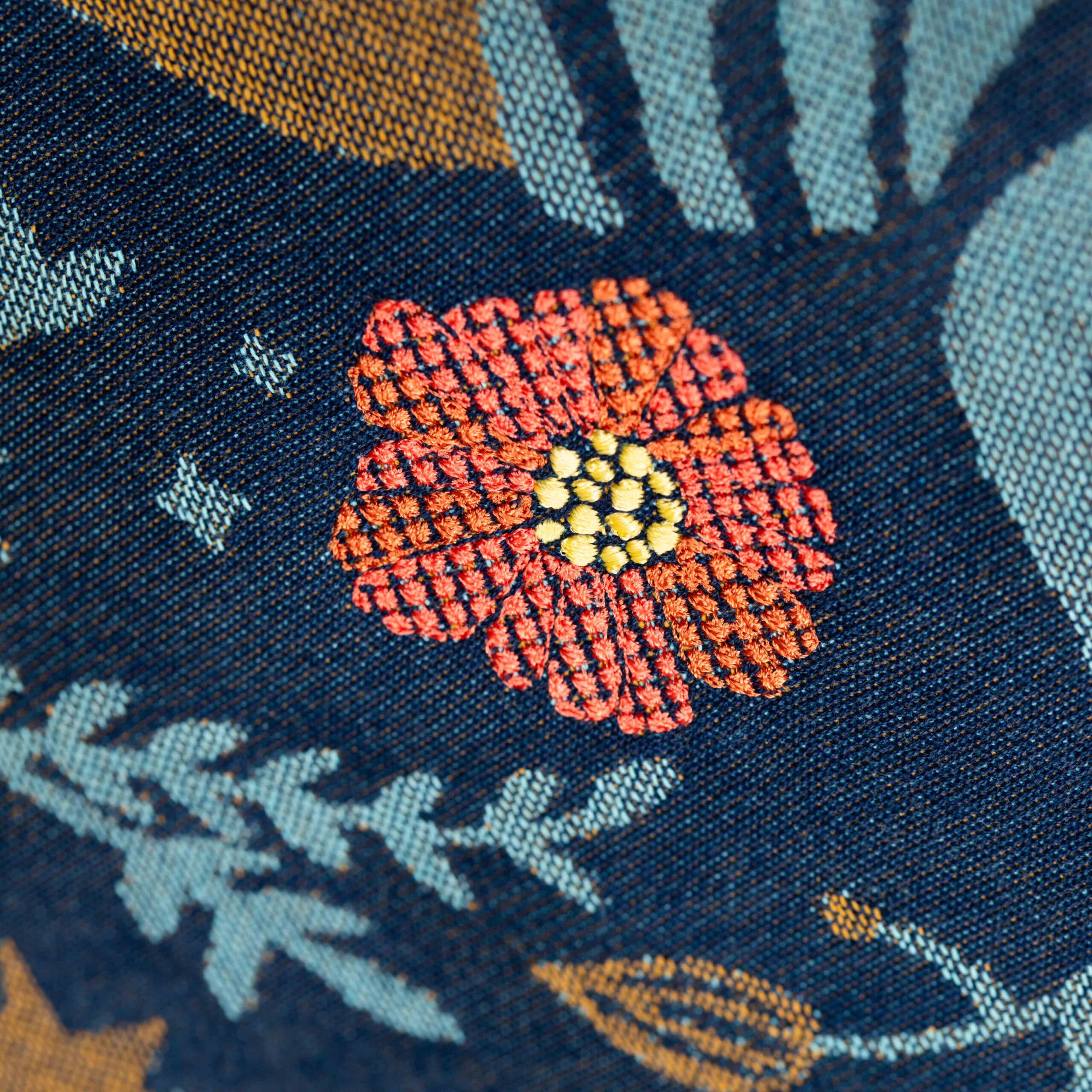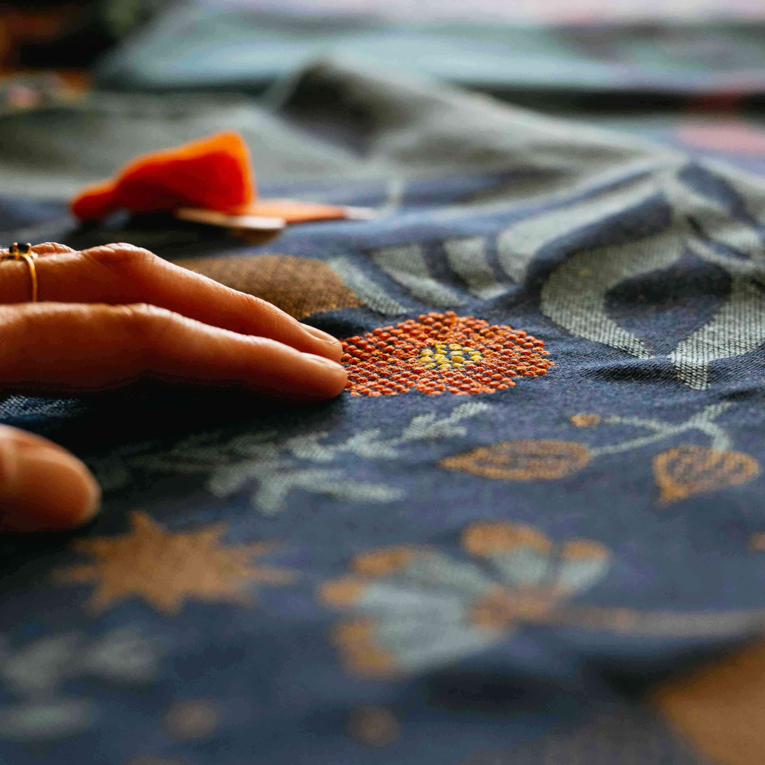 Grâce au tissage en double trame et à l’ajout d’une fine broderie, un jeu de couleurs s’entrelace pour créer des motifs d’une grande richesse et profondeur.