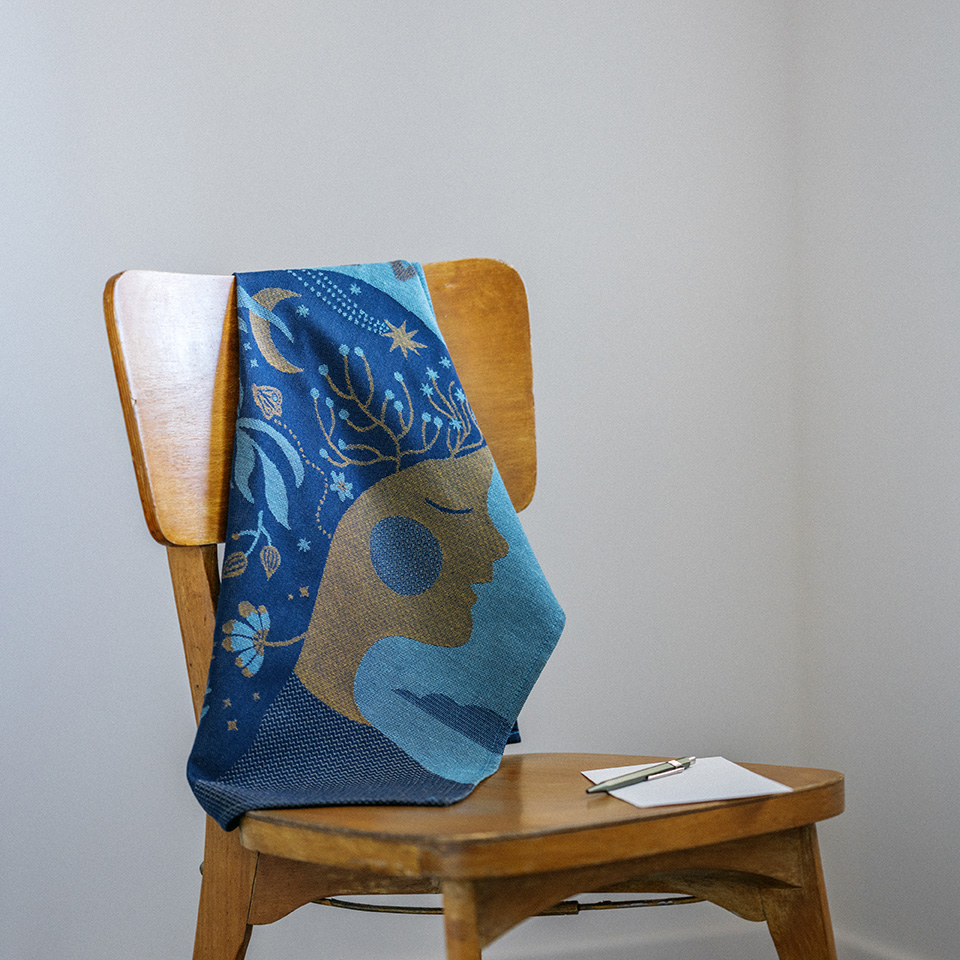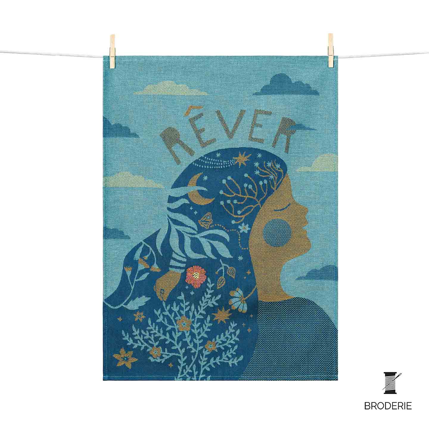 Le torchon « Rêver », imaginé par Hélène Druvert, invite à l’évasion. Un visage d’enfant se dessine dans le ciel, tandis que sa chevelure devient un jardin enchanteur où s’entrelacent fleurs, feuillages et merveilles.