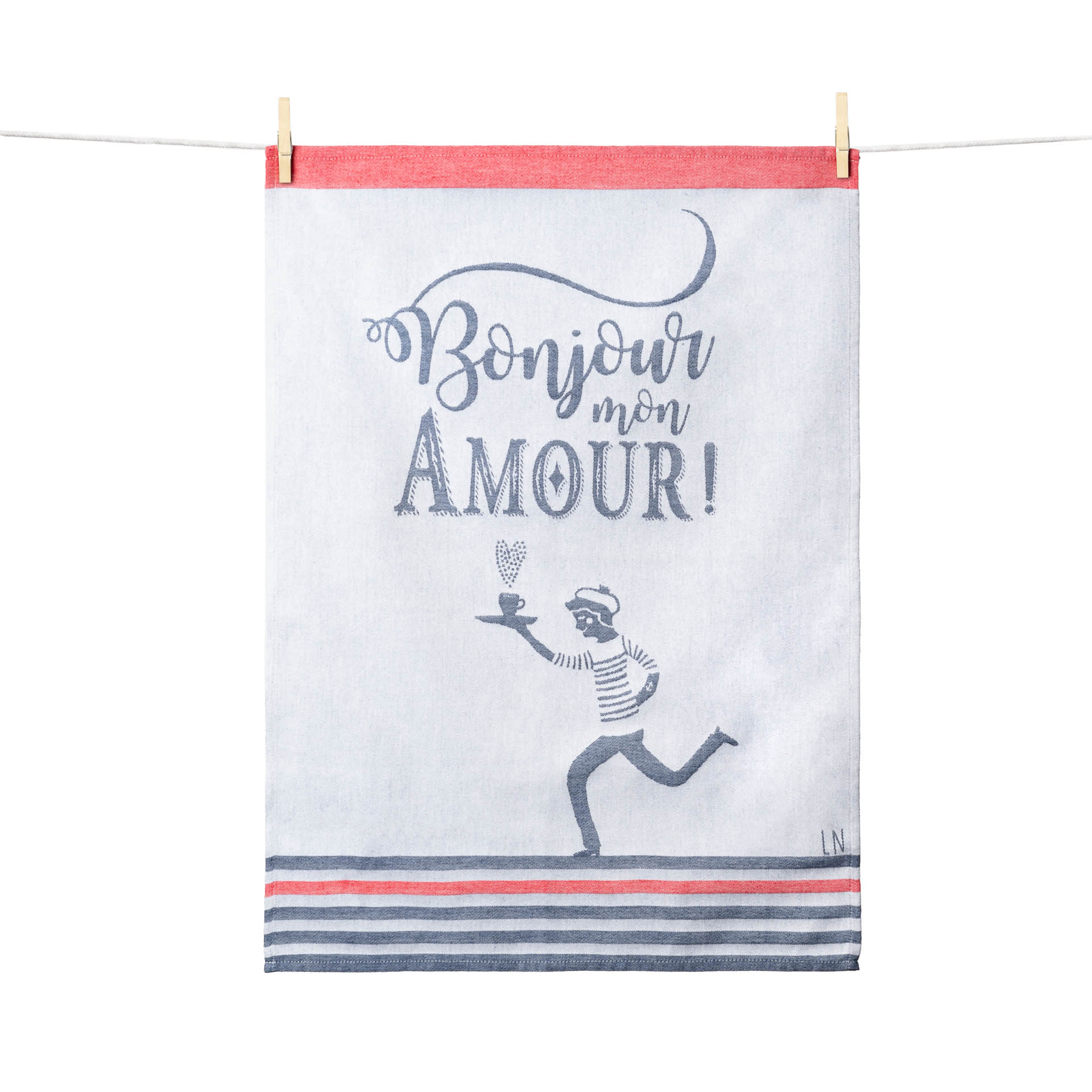 Le torchon « Bonjour mon amour » dessiné par Hélène Druvert a été inspiré des garçons de café parisiens et de l’univers romantique de l’artiste.